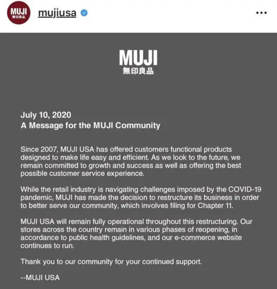 2020年7月,无印良品官方公告显示,由于新冠病毒大流行造成的影响,其美国子公司在负债67亿日元后,已经申请破产保护。从2006年高调入局北美市场算起,无印良品在美国已经累计关停了18家门店。