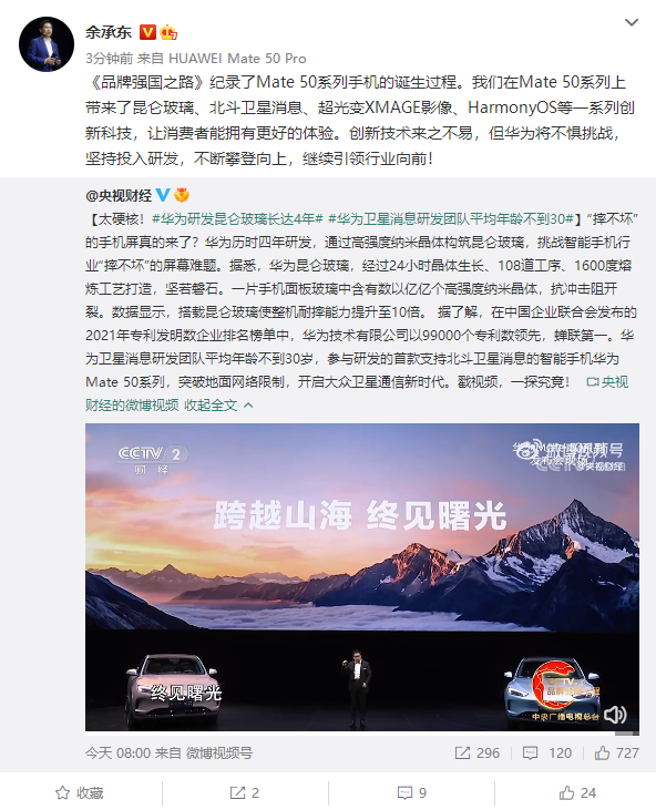 对此,余承东表示,十年前没人知道、认可华为品牌,然而就在今天,华为已经积累了一些核心技术,华为在Mate50系列上带来了昆仑玻璃、北斗卫星消息、超光变XMAGE影像、HarmonyOS等一系列创新科技,让消费者能拥有更好的体验。