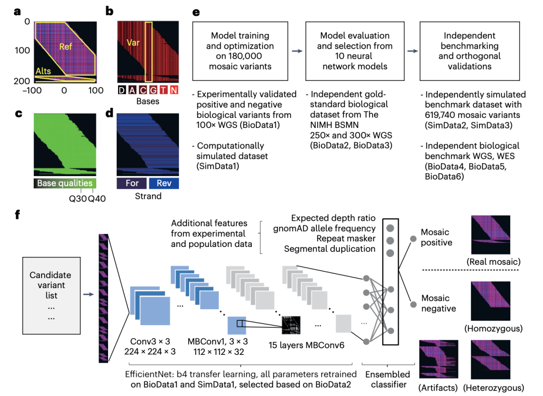 在此过程中诞生的 DeepMosaic,结合了基于图像的单核苷酸 MV 的可视化模块,和基于卷积神经网络的、用于不依赖对照样本的 MV 检测的分类模块。