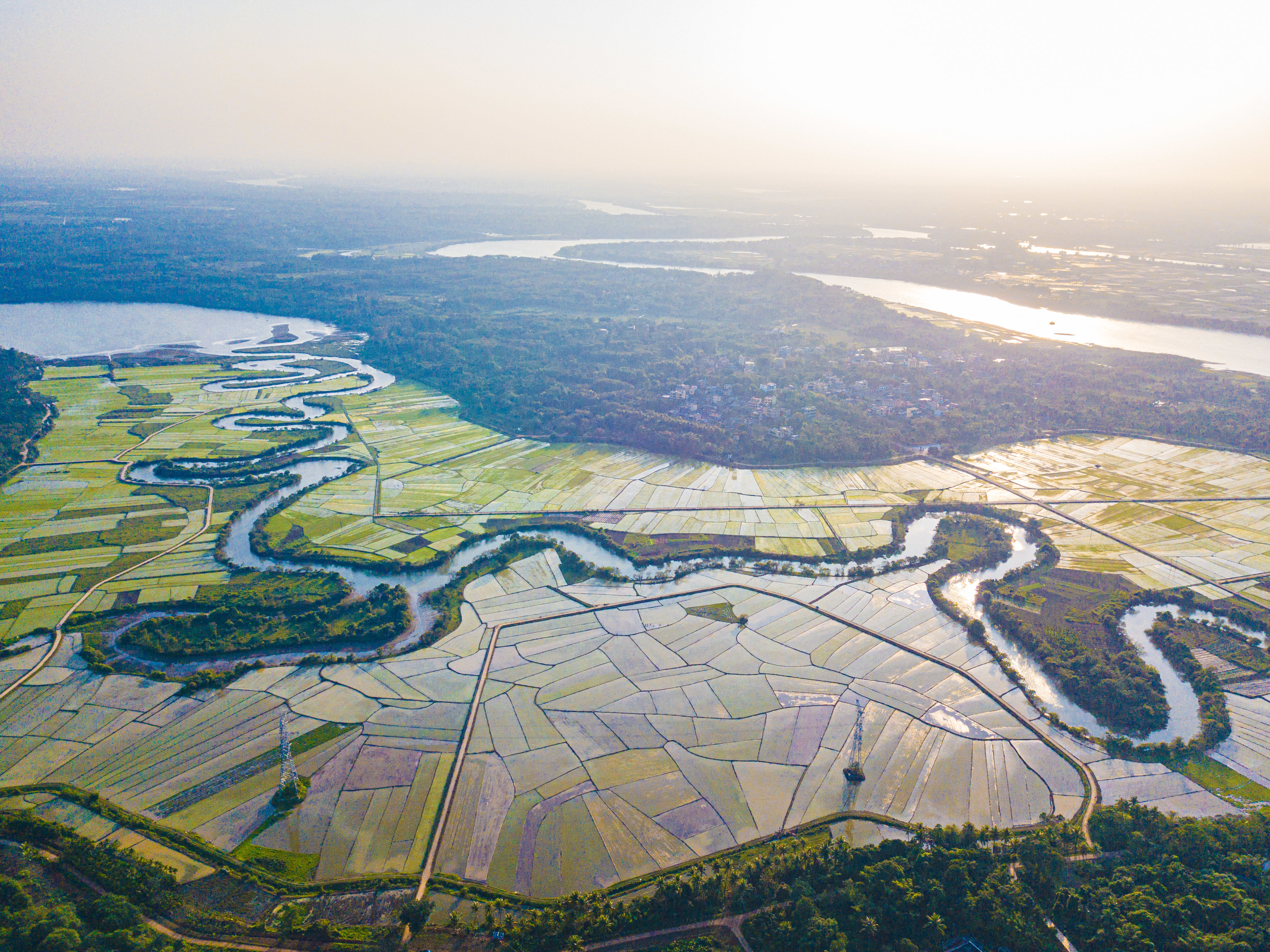 近日,位于海口市琼山区的海口三十六曲溪省级湿地公园及周边的稻田春意盎然。农民在稻田里忙着种植早稻,蜿蜒的河道与连片的早稻田交织成景,勾画出一幅幅充满生机的美丽图画。