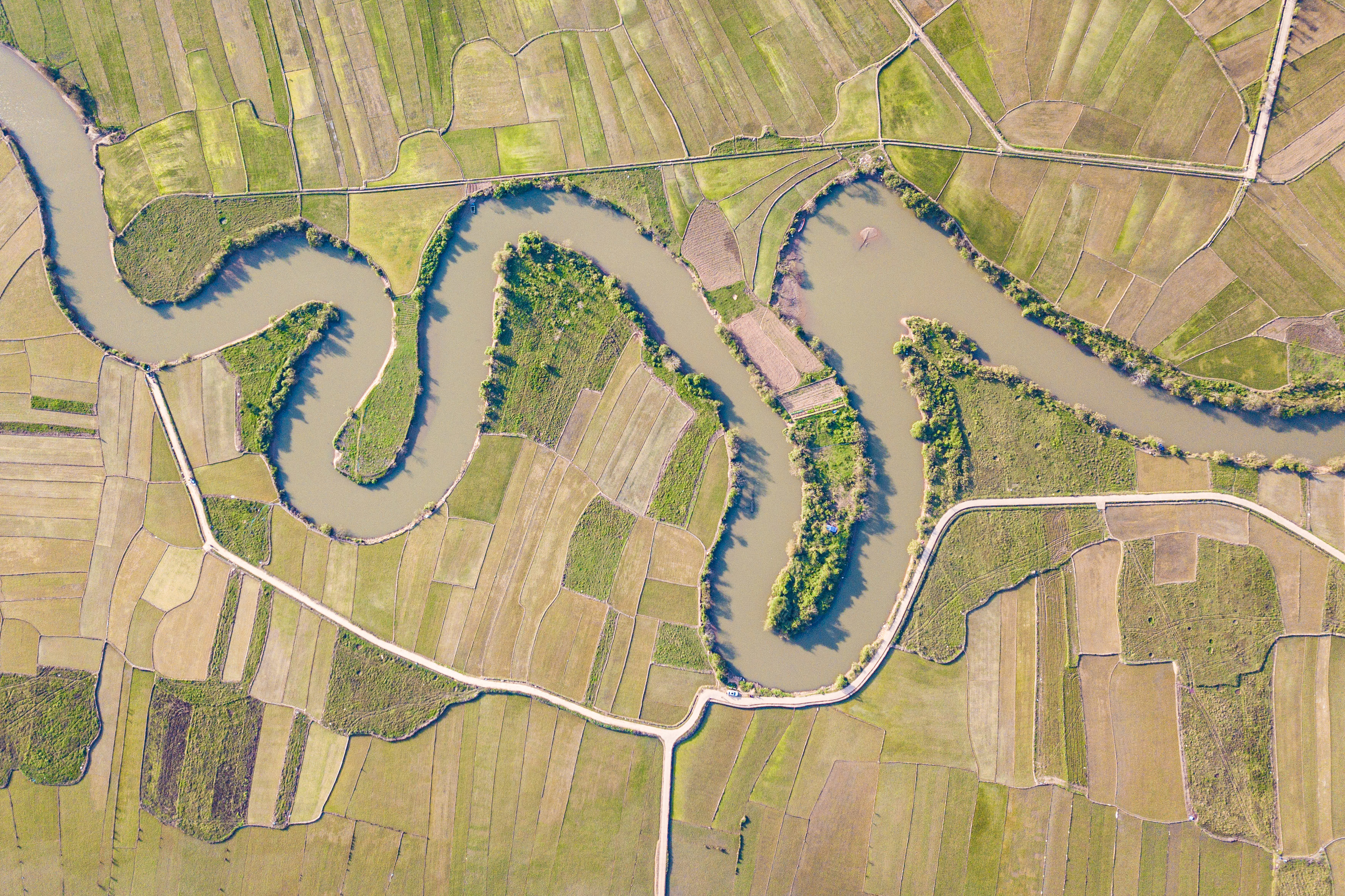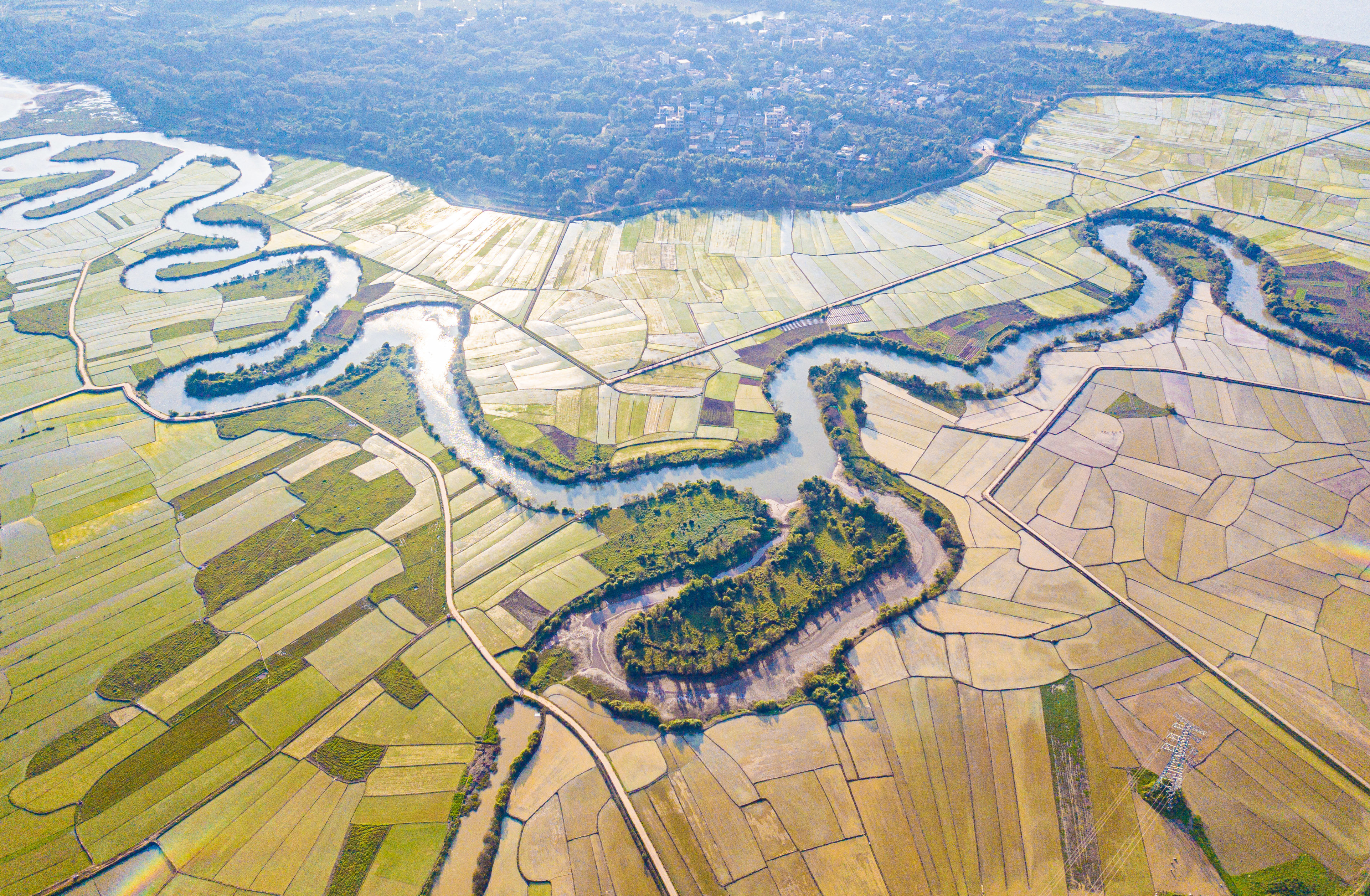 这是1月30日拍摄的海口三十六曲溪省级湿地公园及周边的稻田(无人机照片)。新华社记者 蒲晓旭 摄