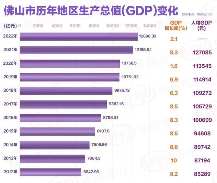 根据广东省地区生产总值统一核算结果,2022年,佛山全市地区生产总值12698.39亿元,增长2.1%。