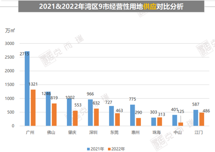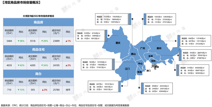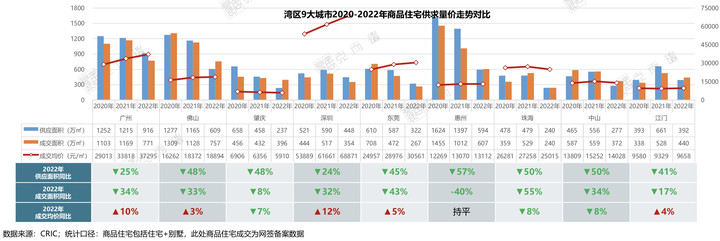 数据显示,2022年湾区9城全年供应商品住宅4035万㎡,同比减少43%,成交面积4205万㎡,同比减少34%。