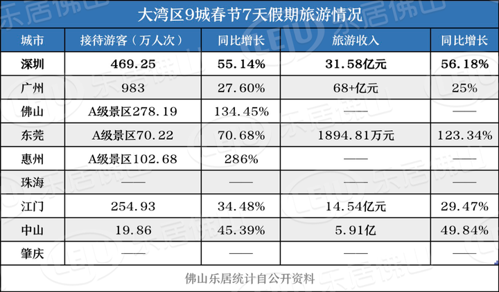 从目前公开数据显示,大湾区9城今年春节的旅游情况同样回暖明显。