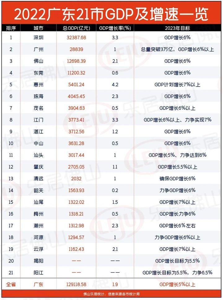 据佛山乐居统计,截止目前,广东21市已全部立下2023年经济目标,其中,已有19个城市公布了2022年的GDP数据。