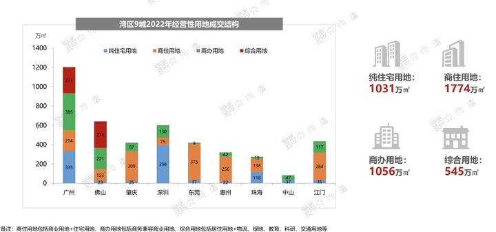 据克而瑞数据统计显示,2022年湾区供地类型仍以商住用地为主,肇庆、东莞占主导地位,成交量均超300万方,仅中山无商住用地出让。