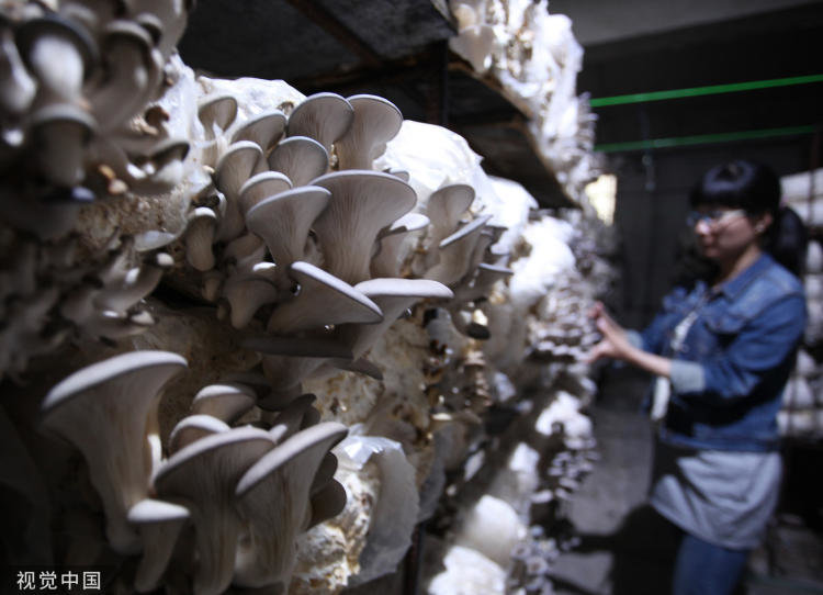 如今的张家口仍在发展蘑菇种植加工业,图为村民在“地下大棚”培植食用菌。/视觉中国
