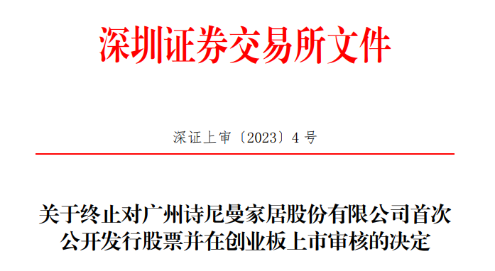 2022年6月,诗尼曼递交招股书拟于深交所创业板上市,7月,诗尼曼收到问询函后迟迟未给回复,9月末,招股书财务数据需要更新,IPO终止。12月28日,诗尼曼重启IPO,十天不到,1月4日诗尼曼申请撤回发行上市申请文件,深交所决定终止对其首次公开发行股票并在创业板上市的审核。
