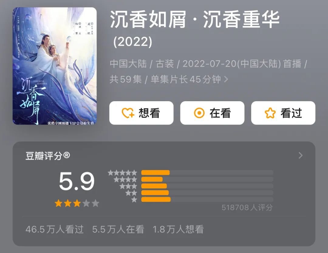 杨紫本年度两部作品,一部现偶《余生,请多指教》以及一部古偶《沉香如屑》,前者豆瓣评分6,后者5.9。其中有意思的是,尽管《沉香如屑》相对于同周期内的三部古偶而言体感声势较弱,但各方面数据出乎意料地高,无论是艺人讨论度、粉丝增量还是角色讨论,杨紫与成毅都靠着这部剧的男女主演在本年度有效播剧的行列上占得了前列。