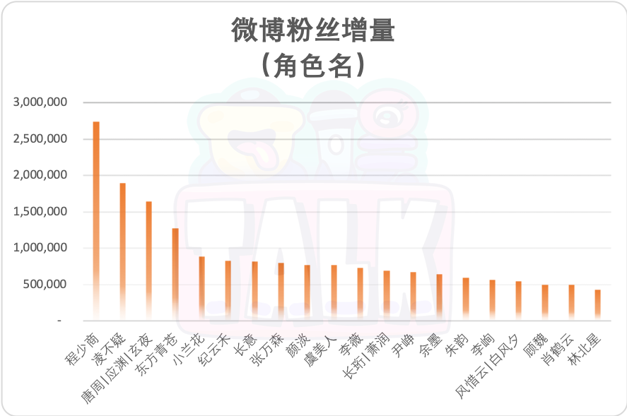 整体数据上,《星汉灿烂》热播的2个月内,赵露思微博粉丝增量接近300万,是本年度热播剧演员当中的增幅首位。在该剧中与她搭档演出的吴磊也以接近200万的增幅排名第二。《苍兰诀》主演王鹤棣与虞书欣,则分别以127万以及88万位列第五与第六位。