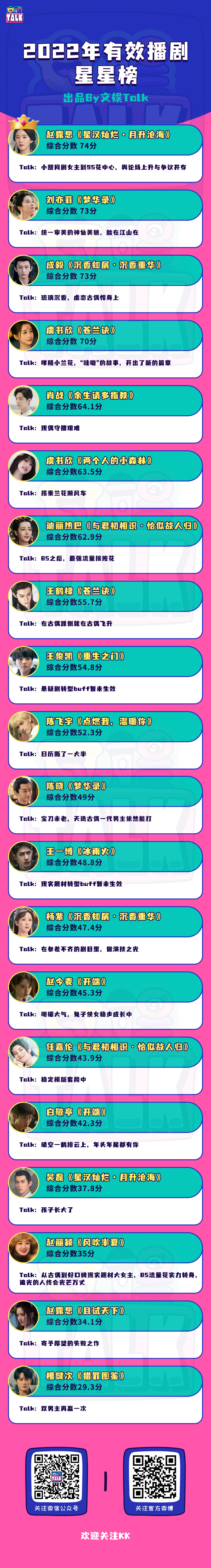 《文娱Talk》发起的【有效播剧】系列05期,kk以艺人讨论度、角色讨论度、作品口碑、艺人对剧集讨论贡献占比、商务转化和社交媒体增量,多维度为本年度热播剧作的演员们排列了一下年度有效播剧(工作)的榜单(特此鸣谢艾漫数据):