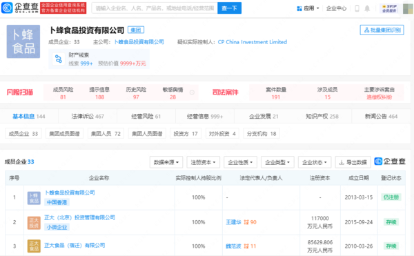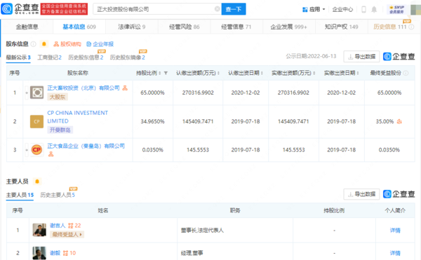 企查查APP显示,正大集团是泰籍华人创办的知名跨国企业,在中国以外称作卜蜂集团(Charone Pokphand Group),是一家以农牧食品、零售、电信三大事业为核心,同时涉足金融、地产、制药、机械加工等10多个行业领域的多元化跨国集团公司,其国内关联公司为正大投资股份有限公司。