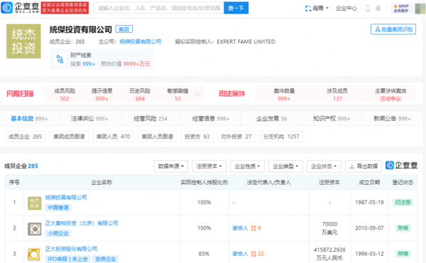 正大集团在香港还同时设立了卜蜂食品投资有限公司、统杰投资有限公司。其中,卜蜂食品投资有限公司所属集团共有33家成员企业,统杰投资有限公司所属集团成全企业达265家。