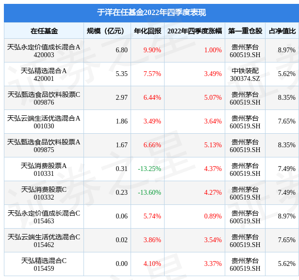 截止2022年四季度末,基金经理于洋旗下共管理10只基金,本季度表现最佳的为天弘甄选食品饮料股票A(009875),季度净值涨5.13%。