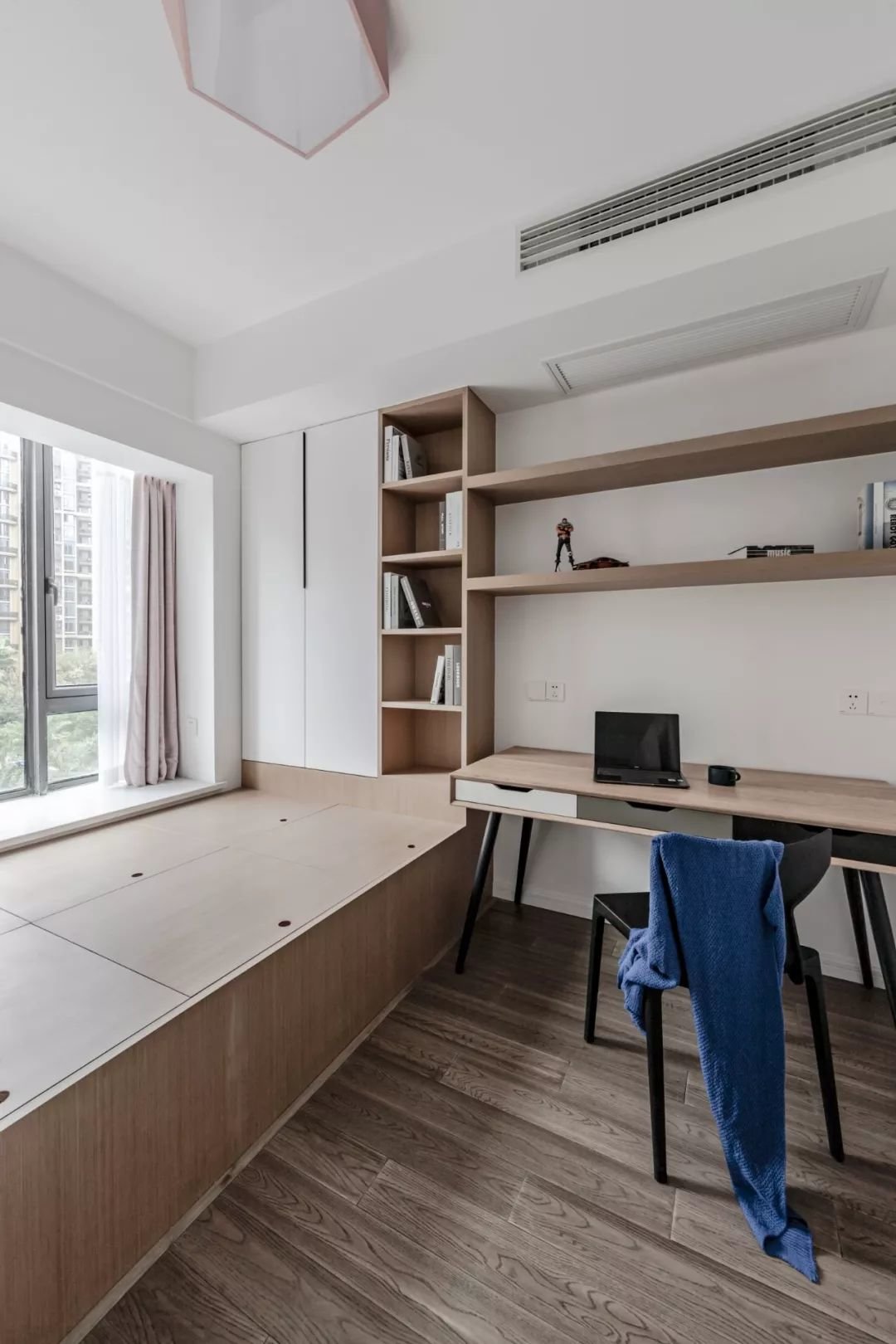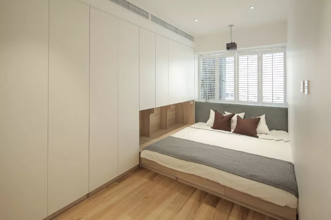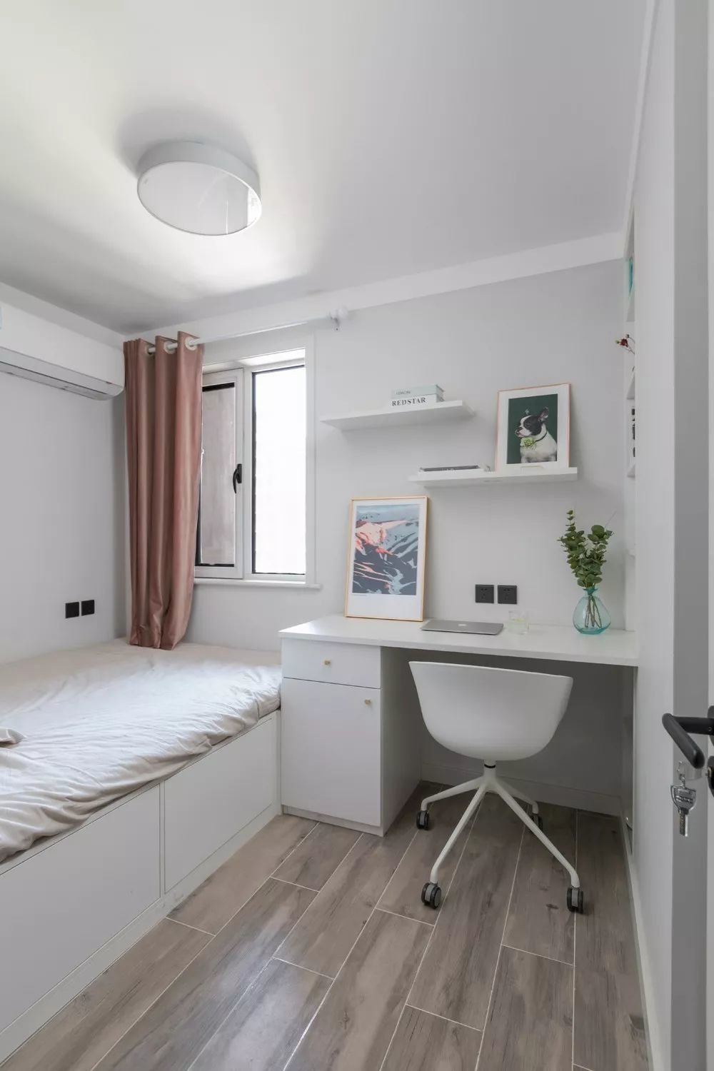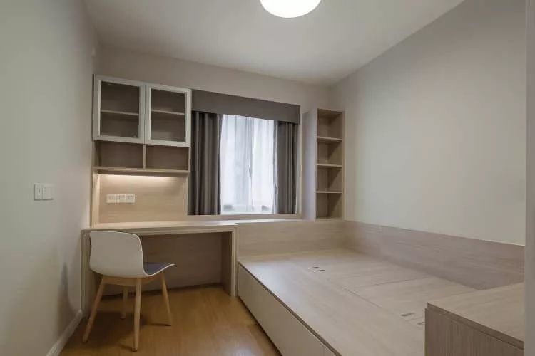 如果觉得成品床的空间利用不够到位,那么就可以通过靠墙定制榻榻米床的设计,让空间有着更加实用丰富的收纳位置,榻榻米床还可以与书桌或衣柜结合起来,显得简洁而又实用精致。
