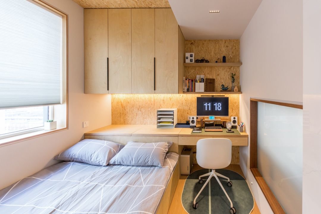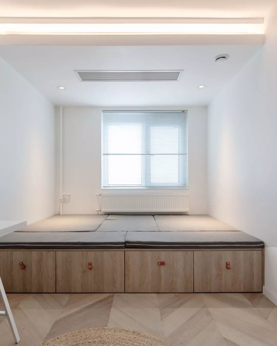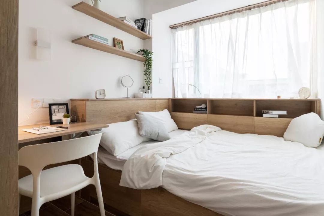 如果觉得成品床的空间利用不够到位,那么就可以通过靠墙定制榻榻米床的设计,让空间有着更加实用丰富的收纳位置,榻榻米床还可以与书桌或衣柜结合起来,显得简洁而又实用精致。