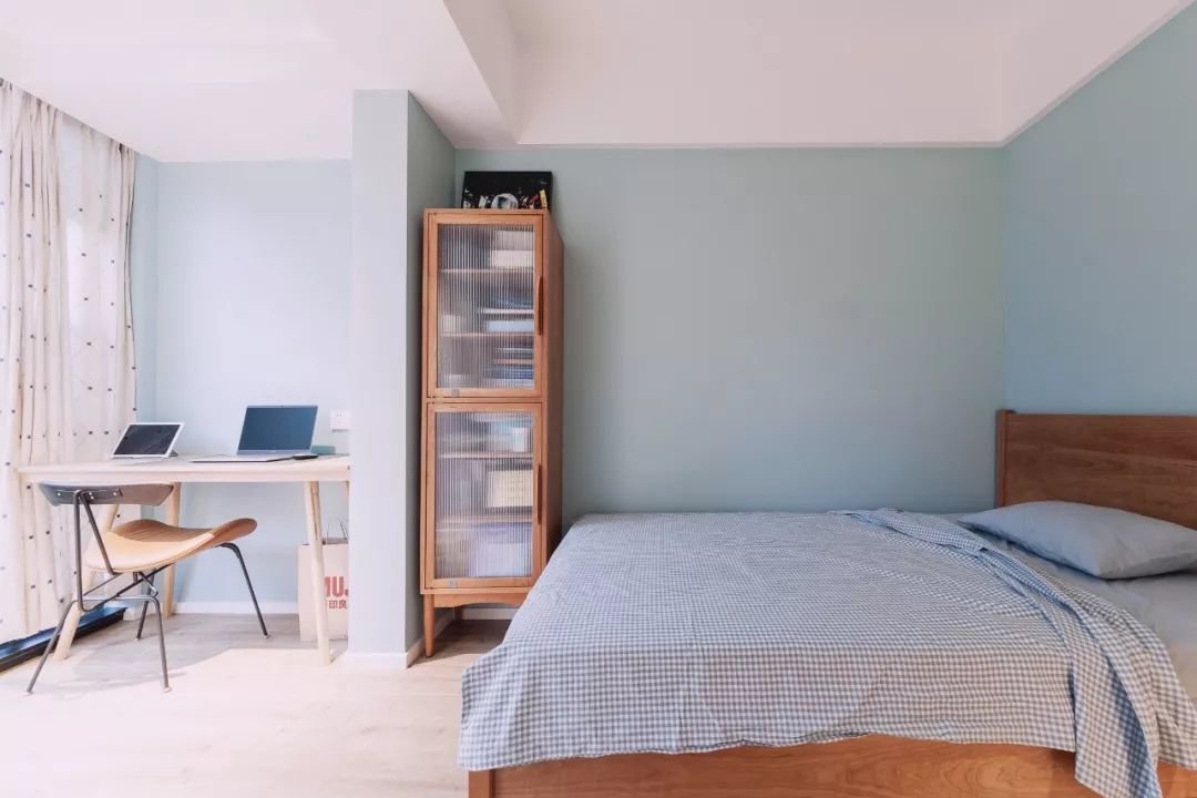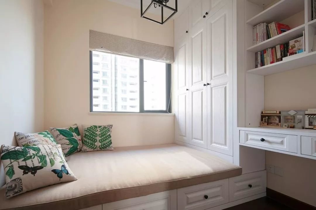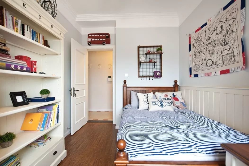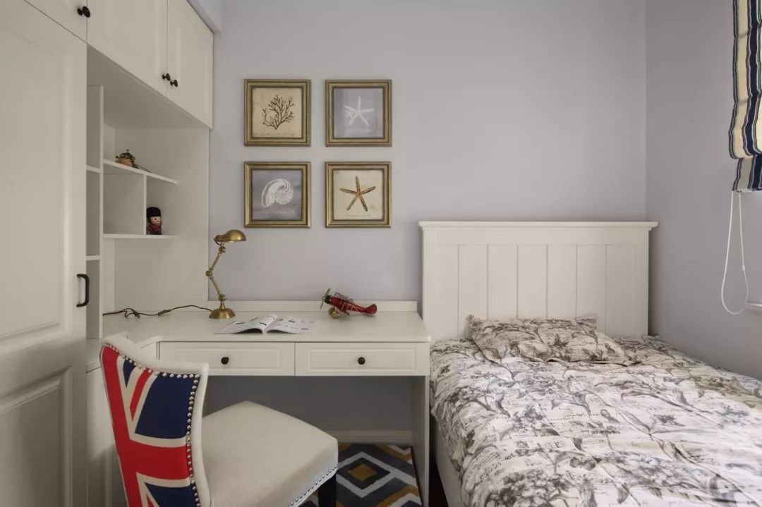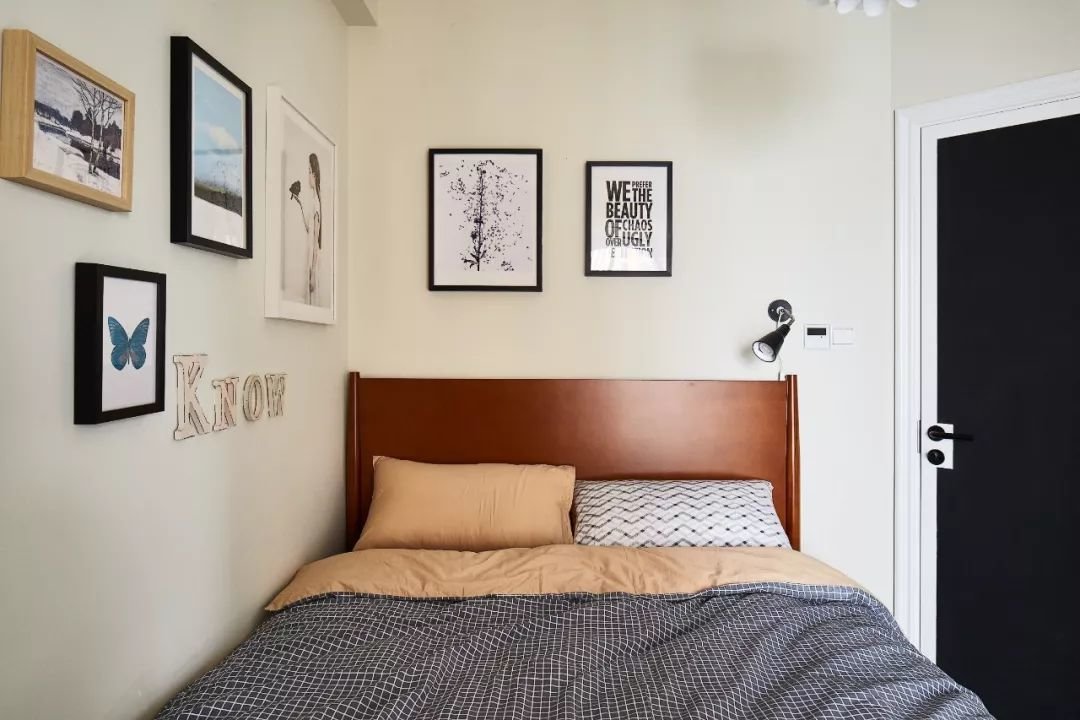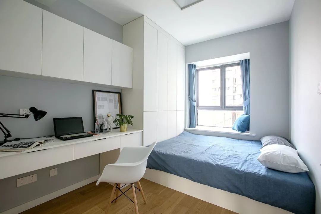在小户型空间里,往往都会有个卧室的面积是比较小的,这个卧室的床铺一般是不能居中摆放,而是要靠墙布置,这样布置的床铺,就会有一侧是靠墙的了,通过这样布置可以让空间显得更加实用宽敞,同时留出足够的通道让空间更加舒适。而且小卧室如果作为小孩房的话,有一侧靠墙布置,还可以给孩子带来安全感,不用担心睡觉时候转身不小心滚到床下。