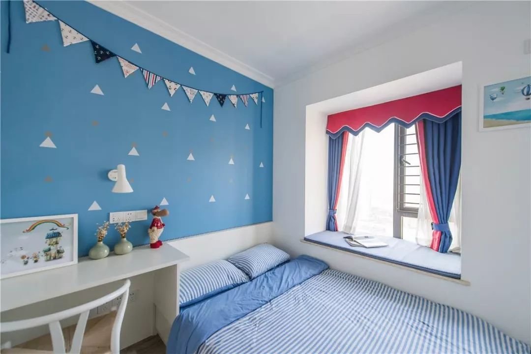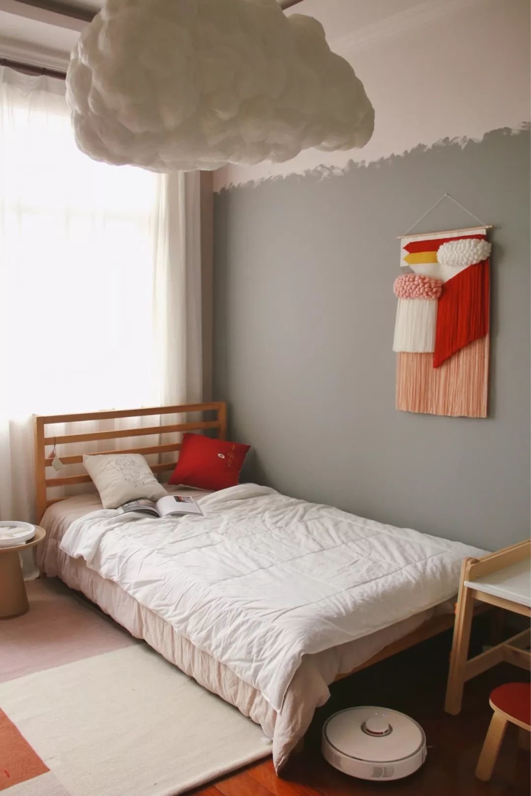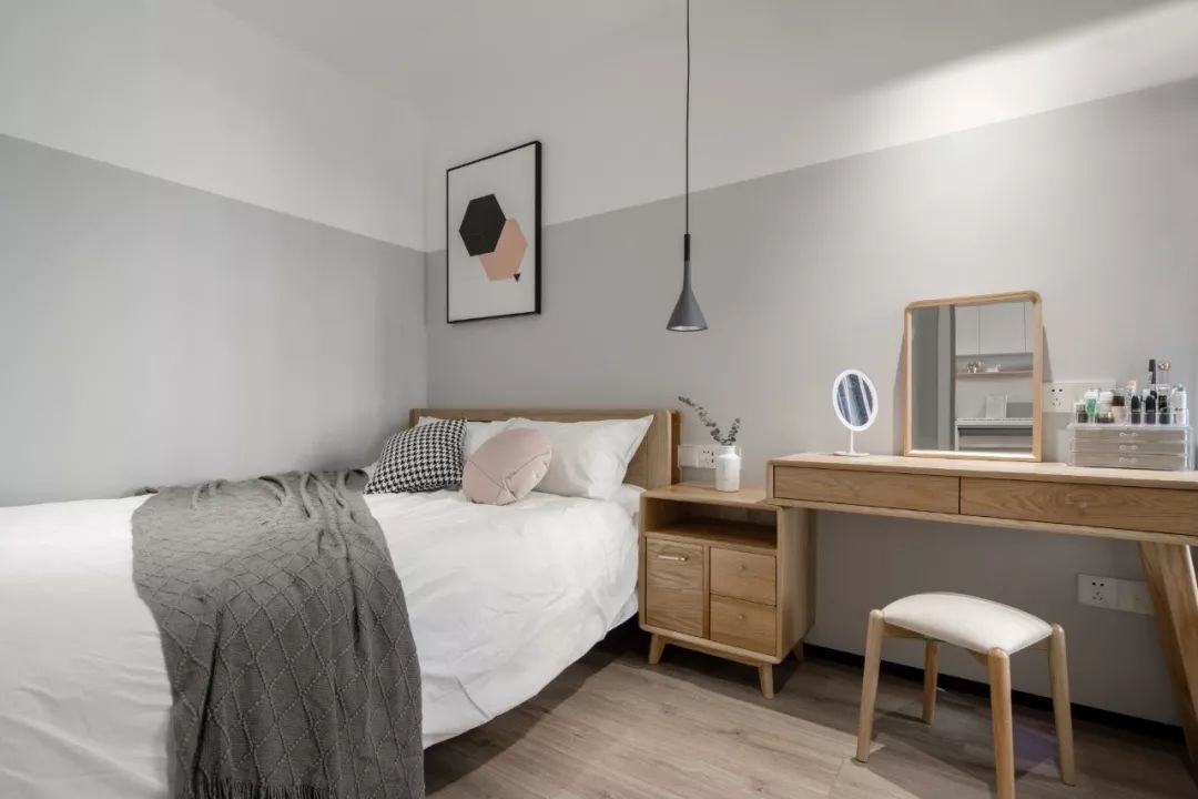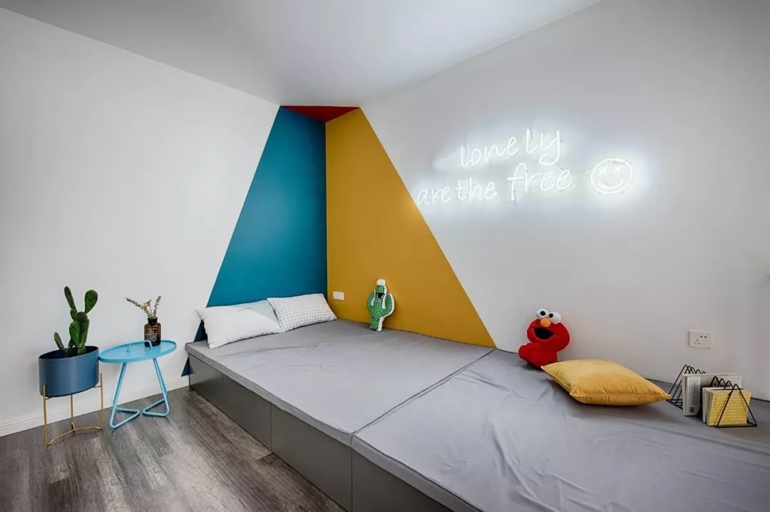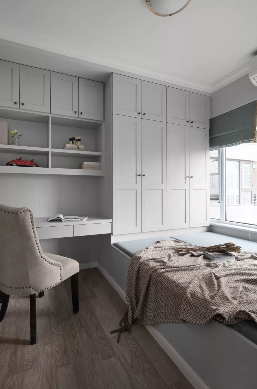 在小户型空间里,往往都会有个卧室的面积是比较小的,这个卧室的床铺一般是不能居中摆放,而是要靠墙布置,这样布置的床铺,就会有一侧是靠墙的了,通过这样布置可以让空间显得更加实用宽敞,同时留出足够的通道让空间更加舒适。而且小卧室如果作为小孩房的话,有一侧靠墙布置,还可以给孩子带来安全感,不用担心睡觉时候转身不小心滚到床下。