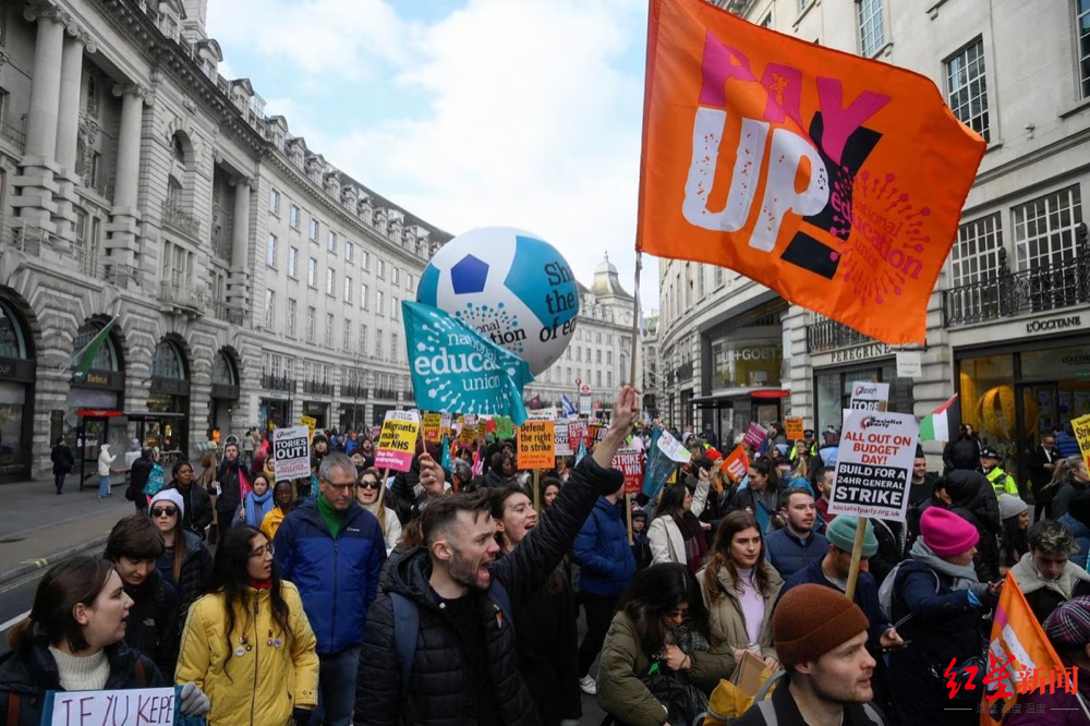 当地时间2月1日,英国多达50万人因薪资问题举行罢工,抗议加薪比不上通货膨胀的速度,同时表达对英国养老金、恶劣工作环境等问题的不满。