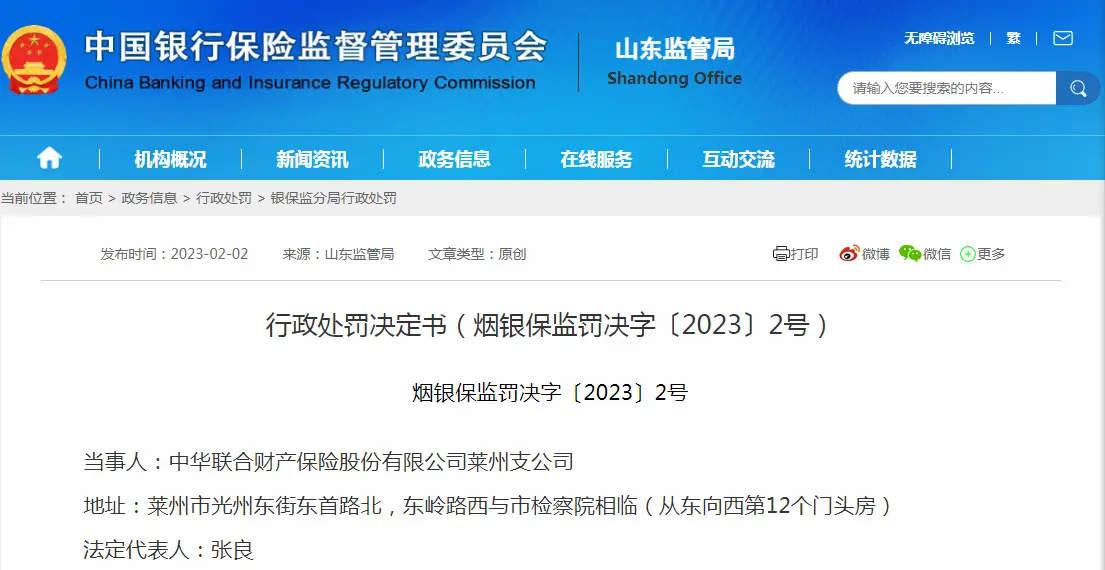 银保监会山东监管局2月2日发布的行政处罚决定书(烟银保监罚决字〔2023〕2号)显示,中华联合财产保险股份有限公司莱州支公司因存在拒保摩托车交强险问题被罚款12万元。