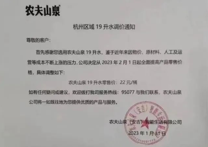 最近流传的一张农夫山泉《杭州区域19升水调价通知》显示,因物价、原材料、人工及运费等成本上涨,2月1日起,杭州市19升桶装水价格调整为22元/桶。此前售价为20元/桶,每桶涨价2元。
