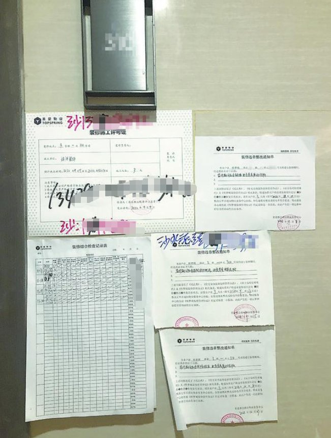 今年2月,在贺女士购买房屋同层,记者看到多户门前被莱蒙都会商业物业服务中心张贴了“装修违章整改通知单”。
