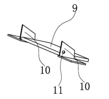 最后,如上图,为上述加工设备结构中的下挡板与侧挡板之间的结构示意图。通过下挡板9与两个侧挡板10形成的挡气结构示意,其中的下挡板是可移动的,使用时将其倾斜向上移动至其前端靠到或靠近复合膜的内侧基底膜上即可。