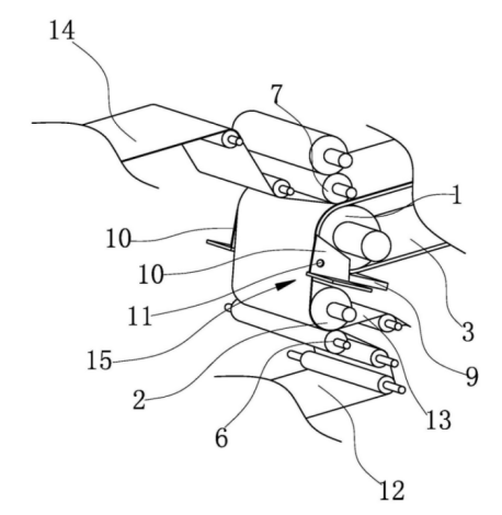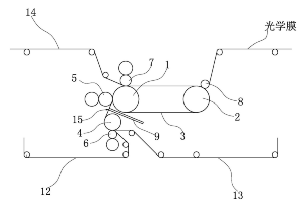 如上图,为该专利中提供的具有微棱镜结构光学膜连续加工方法的整体流程结构示意图。该结构包括有:主加热辊1、冷却辊2、微棱镜模具3、辅热辊4、水平压辊5、下压辊6、上压辊7、冷却压辊8、下挡板9、侧挡板10、氦气进气孔11、面膜12、基底膜13、引膜14以及复合膜15。
