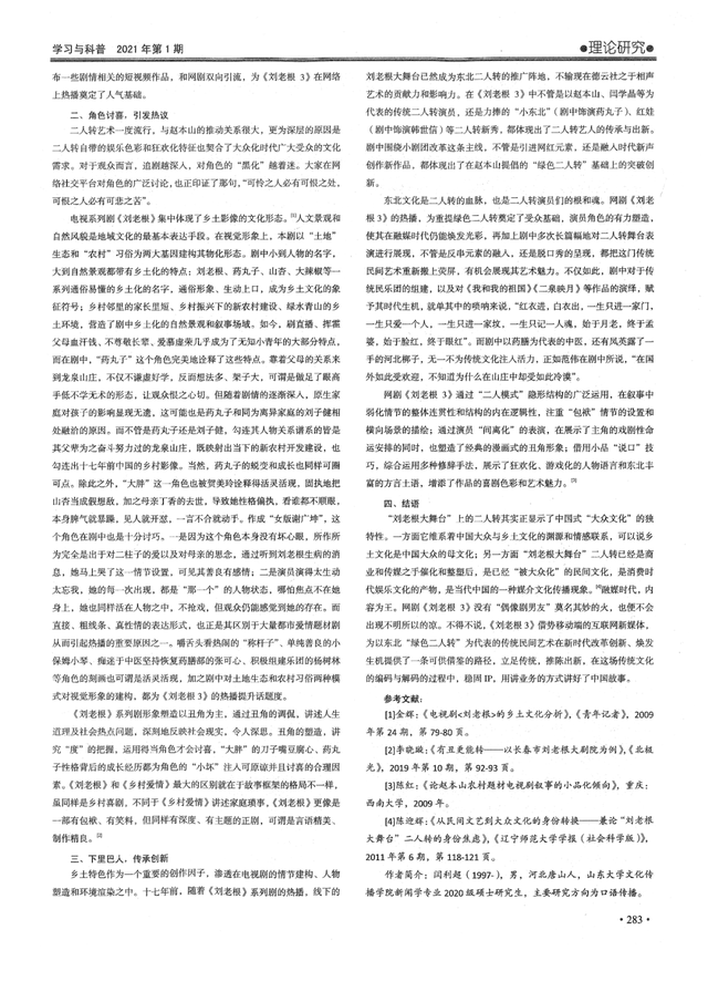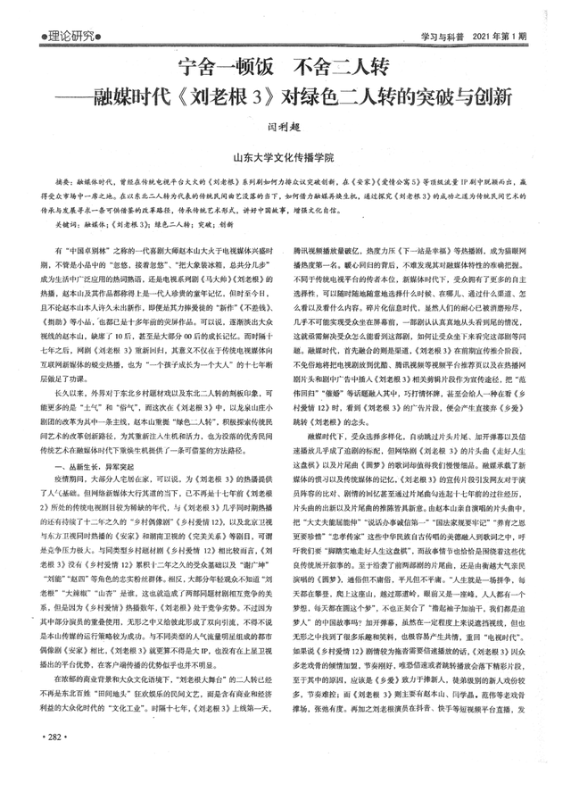 引用参考格式:闫利超.宁舍一顿饭 不舍二人转——融媒时代《刘老根3》对绿色二人转的突破与创新[J].学习与科普,2021(01):282-283.