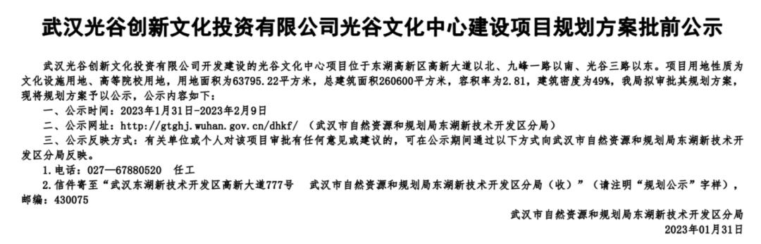 近日,武汉市自然资源和规划局东湖新技术开发区分局官网发布《武汉光谷创新文化投资有限公司光谷文化中心建设项目规划方案批前公示》。这预示着,光谷片区重磅地标光谷文化中心来了!
