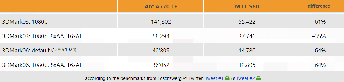 根据测试者给出的 3DMark 基准测试结果,该卡比 Intel Arc A770 弱一些,至少从跑分来看他要比 A770 慢 35% 到 64%。