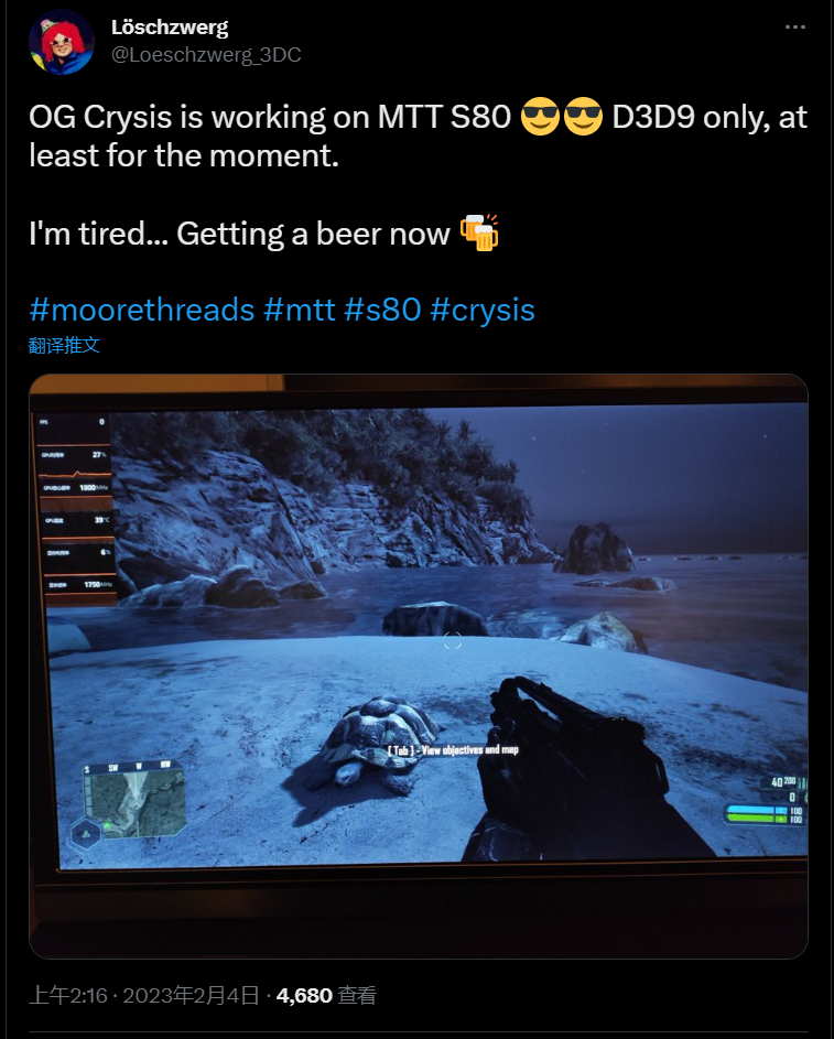 除此之外,这张卡还成功运行起了不在适配名单中的《孤岛危机》。不过,它仅适用于 D3D9 模式。