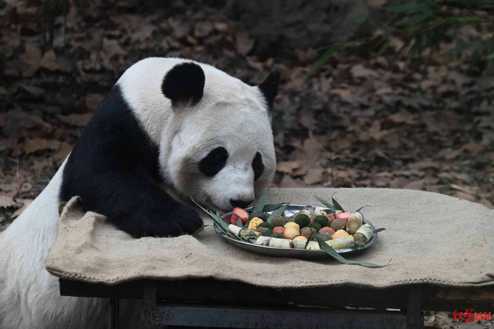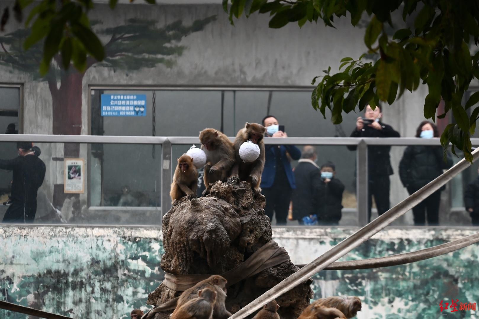 除了狮子老虎,当天动物园里的大熊猫、猴子等动物也吃到了色香味俱全的“汤圆”。其中大熊猫吃到了五颜六色的彩色“汤圆”。“熊猫吃的食物有好多颜色。”围观的小朋友一边看,一边转头给身后的父母说。