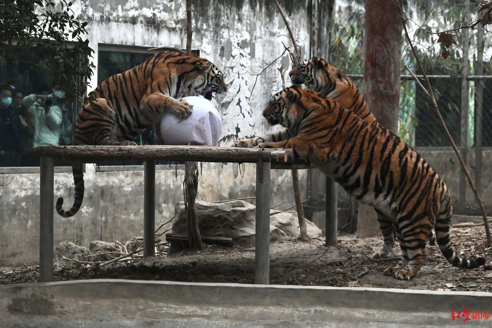 2月5日上午9点左右,成都动物园门口已经陆陆续续有带着孩子来玩的家长。园内的狮虎苑更是里三层外三层,只见园区木架上放着“巨形汤圆”,3只东北虎齐头并进冲了过来,引得游客一片惊呼。