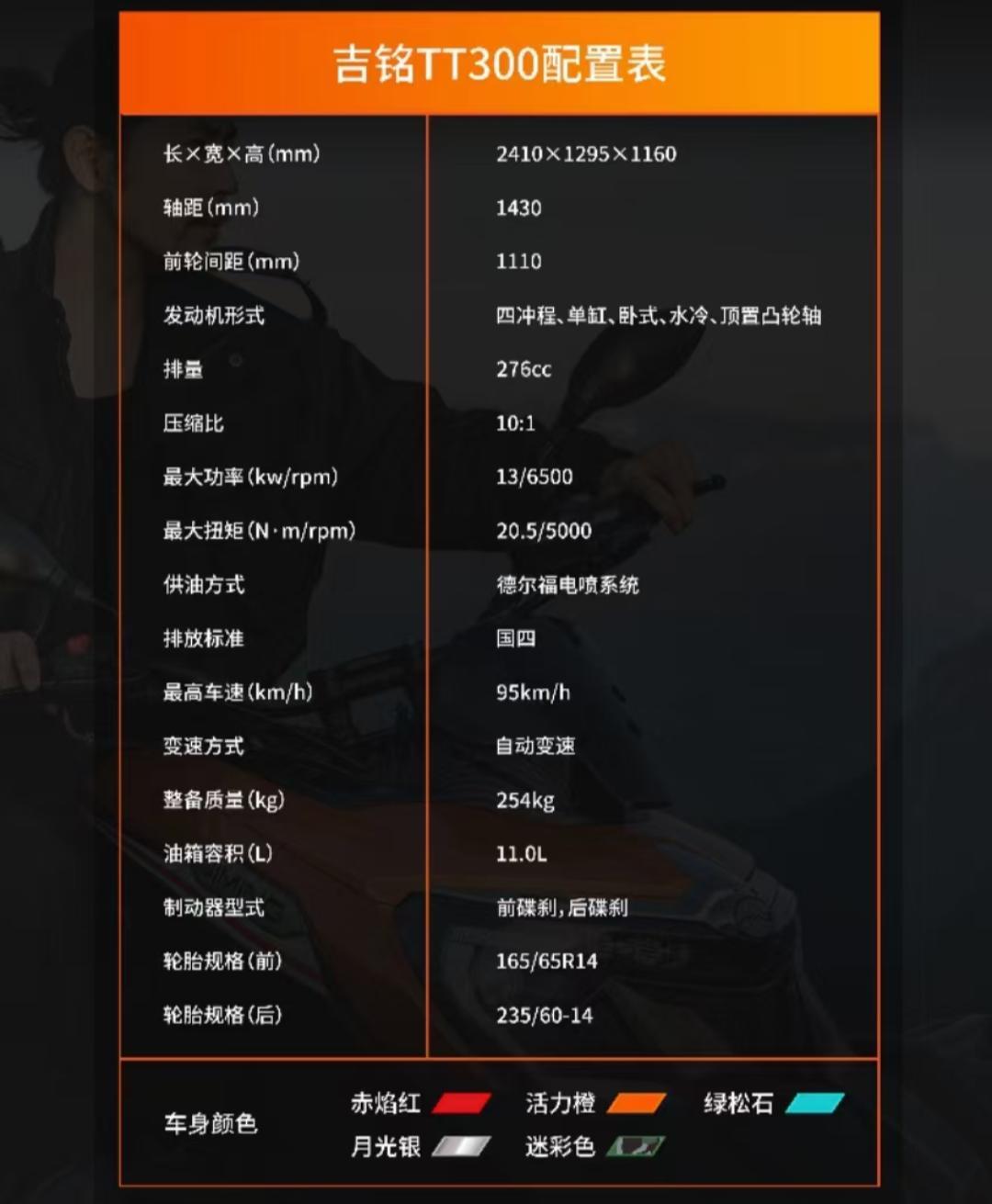 在动力方面,吉铭坦途300搭载了一颗单缸水冷发动机,排量:276cc,最大功率:13 kW/6500 rpm,最大扭矩:20.5 N.m/5000 rpm,电喷系统由德尔福提供,传动方式为链条。