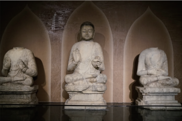 北齐·赵郡王高叡造释迦牟尼佛、阿閦佛和无量寿佛在河北博物院《曲阳石雕》陈列展厅对外展出