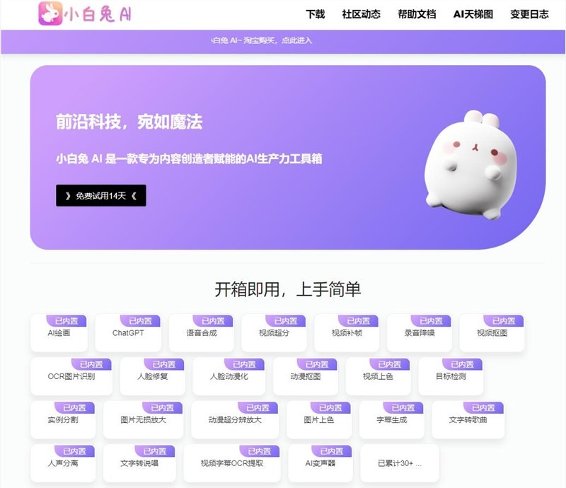近日,站长之家发现了一款有趣的AI工具,称为小白兔AI,它是一款专为内容创作者赋能的生产力工具箱。最先进的科技,如同魔法般神奇。它目前拥有18多个AI模型,涵盖语音合成、视频补帧、视频超分、目标检测、图片风格化、OCR识别等领域,支持Windows、Mac、Linux系统,未来还将适配安卓和苹果设备。