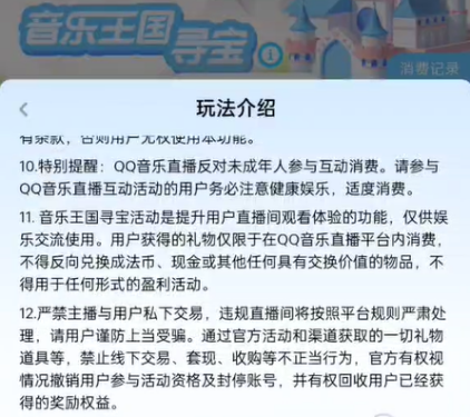 通过查询QQ音乐直播间公示的“音乐王国”玩法介绍,红星新闻记者发现,条款中有明确规定:“用户获得的礼物仅限于在QQ音乐直播平台内消费,不得反向兑换成法币、现金或其他任何具有交换价值的物品,不得用于任何形式的盈利活动。”