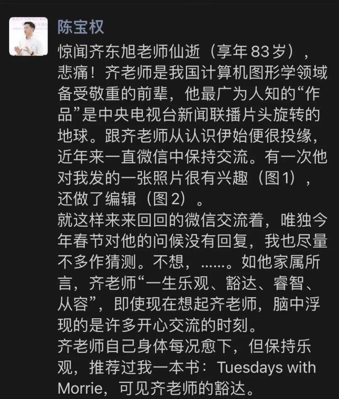 今早,北京大学陈宝权教授也对齐教授的逝世,致以哀悼。