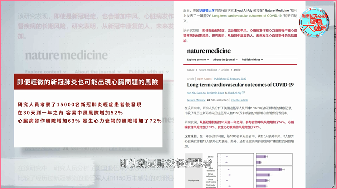 一项发表在世界著名医学杂志nature的研究显示,在感染新冠后的一年内,大家面临20种心血管疾病的风险将大大增加——其中就包括了中风、心梗。