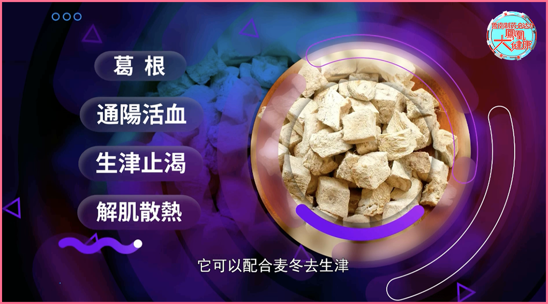 葛根具有生津止渴的功效,可以治疗热病口渴,阴虚消渴等症状。《本草汇言》说到:“葛根,清风寒,净表邪,解肌热,止烦渴。研究发现,葛根中的黄酮类物质,可以增加冠状动脉的血流量,防止心肌缺血、心律失常,以及动脉粥样硬化等病症。