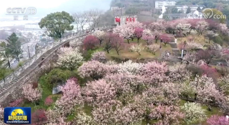 浙江临海的这片梅园背靠古城墙,数十种梅花依着山势次第盛开,吸引市民和游客前来踏青。高雅的梅花与古朴的城墙相映成趣,人们在游览中领略自然之美、历史之美。