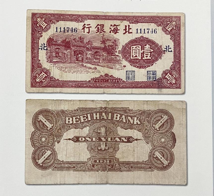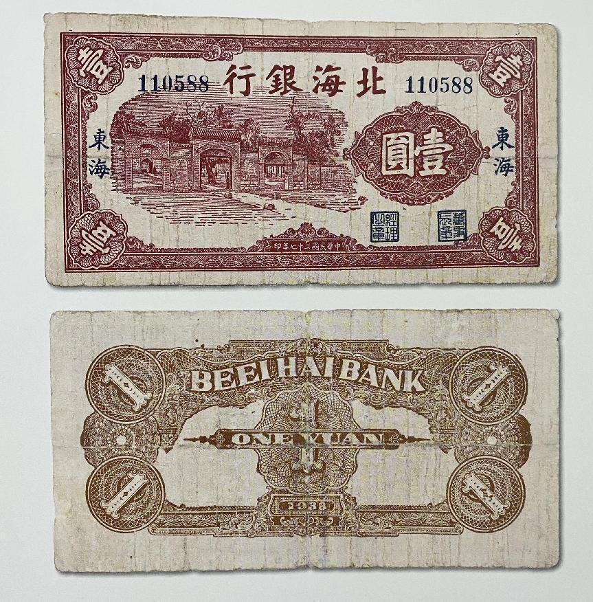 背景:“七七事变”之后,在中国共产党的影响和号召下,全国掀起了轰轰烈烈的抗日救亡运动,抗日战争全面爆发。在山东省胶东区域的版图上,多地成立了共产党的组织,在共产党领导下,建立起了抗日武装,进行了积极的抗日活动。其中活跃着两支比较大的抗日武装:一是在胶东东部山区的文登县(今文登市),中共胶东特委于1937年12月24日创建的山东人民抗日救国军第三军(以下简称三军),是我党领导下的胶东第一支人民抗日武装,该部发动了天福山起义,在牟平雷神庙打响了胶东抗日第一枪。二是在胶东西部莱州湾畔的掖县(今莱州市),中共掖县县委发动了玉皇顶起义,推翻伪政权,解放掖县城,1938年3月9日建立山东第一个县级抗日民主政府,并成立了山东最大的抗日武装——胶东抗日游击队第三支队(以下简称三支队)。三支队坚持一手抓枪杆子,一手抓钱袋子,4月份发起筹建“北海银行”,聘请原青岛中鲁银行总经理张玉田任行长。胶东特委和三军为了摆脱困境,制定了“西进抗日”的策略,于8月12日与三支队合编,取消三支队、保留三军番号。同时三支队所属的军需部门、北海银行、报社全部移交给了三军。这时的根据地以掖县为中心,蓬(莱)、黄(县)、掖(县)三县根据地连成一片。期间宣布北海银行正式成立,仍由张玉田负责,继续发行北海币,同时开办了存款、放款等业务。拟在黄县、蓬莱设分行,黄县开始着手筹建、蓬莱因顽匪蔡晋康的进攻而搁浅。9月18日三军又改编为八路军山东人民抗日游击第五支队(同年12月27日又改称八路军山东纵队第五支队,以下简称五支队)。在部队合编前后皆有战事,加之部队整编繁杂,直到12月1日,环境稳定之后,北海银行才在掖县县政府门前举行了盛大的开业典礼,以扩大社会影响。因日伪顽军的进攻,掖县、黄县、蓬莱相继失陷,胶东特委党政军分两部分转移到大泽山和艾崮山周围山区坚持抗战。1939年3月,北海银行在蓬莱草甸村(今草店村)疏散人员、停止营业,张玉田被介绍到赵保原那里去了(陈文其回忆录)。根据中共中央和山东分局的指示,1939年8月1日北海银行又恢复营业,由陈文其负责联系张玉田取回票版、账簿等物品,继续沿用创建时期的票版印发北海币,在“东、西、南、北”四个海区内流通。1941年7月反投降斗争取得重大胜利,八路军占领牙山,胶东抗日根据地东、西连成一片,北海币在整个胶东根据地范围内流通。初期,胶东北海银行称总行,下设鲁中、清河两分行。1940年秋北海银行总行移至鲁中,成立了山东省北海银行总行,胶东北海银行改称分行。1948年12月1日北海银行与华北银行、西北农民银行合并成立中国人民银行。