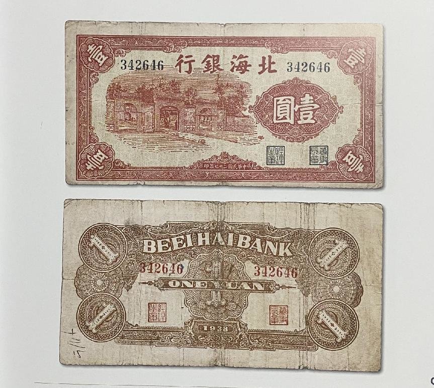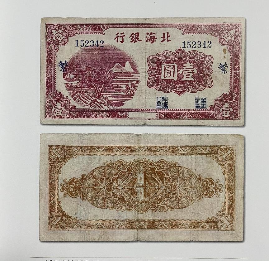 以上是胶东抗日根据地不同时期流通的壹元券北海币,图片翻拍于《北海银行纸币》,西安交通大学出版社2015年7月出版,吕乃涛、苏骏编著。