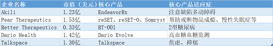 尽管数字疗法行业处于发展初期,但目前已涌现出不少亮点企业。其中已上市的企业包括Akili、Pear、Better、Dario、Talkspace。其中Dario和Better分别在成立后的5年和6年内上市。