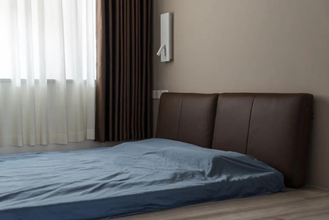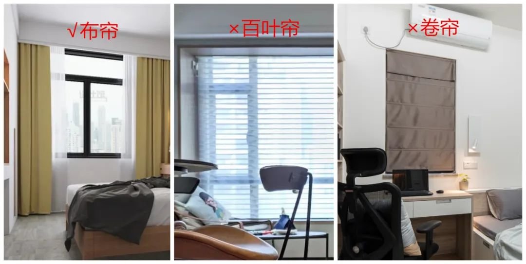 卧室是睡觉休息的空间,如果你对光线敏感的话,就要注意两侧与顶部的漏光问题,为了规避卧室窗帘漏光问题,要做到——顶部要有窗帘盒或帘头;两侧窗帘要贴墙,并要比墙体更长。