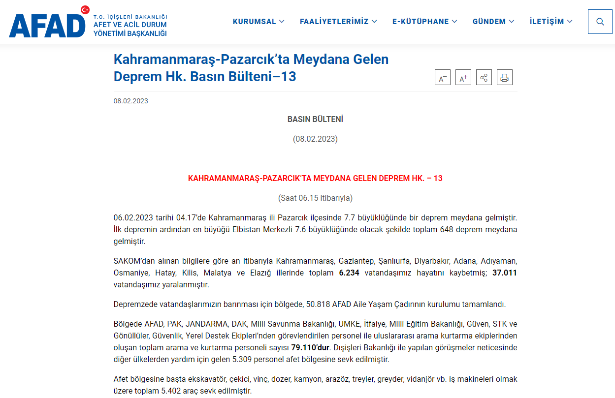 强震发生后,灾区城市损毁严重、人员大量伤亡。土耳其应急灾害管理局当地时间8日表示,地震已造成土耳其7108人死亡。据叙利亚卫生部及救援人员8日消息,叙境内地震死亡人数已超过2500人。