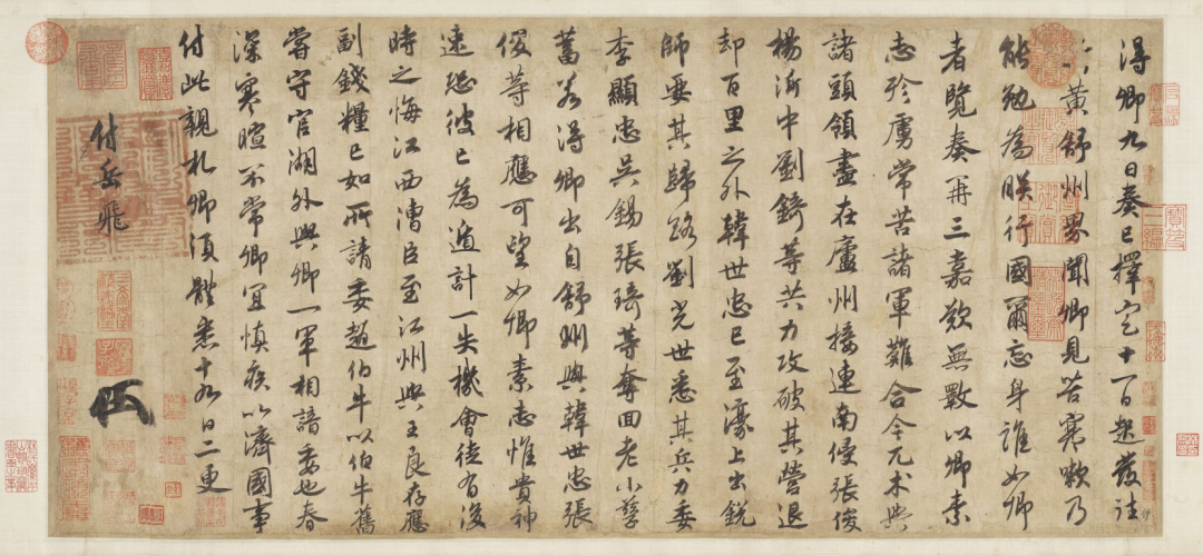这幅作品比前面的长得多,章法严整精湛潇洒,内容主要是在部署军事行动,让岳飞配合其他将领合围兀术,信的末尾高宗说:“春深,寒暄不常,卿宜慎疾以济国事。付此亲札,卿须体悉。”