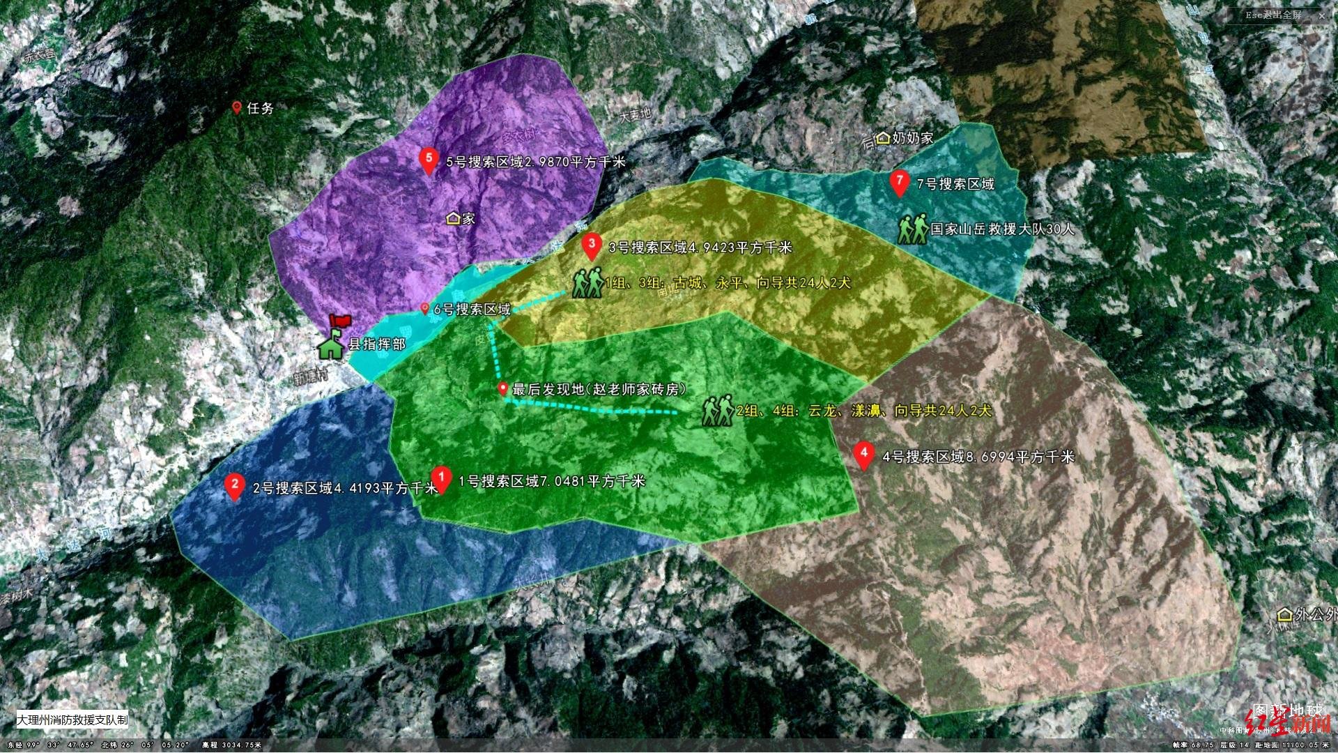 当晚,根据前方搜救指挥部安排,救援人员携带通信设备、防寒保暖物资、救生照明等器材装备,兵分四路分别对1、3、4号区域开展搜索,以及长新乡、失联人员学校和云龙县城进行街面排查。