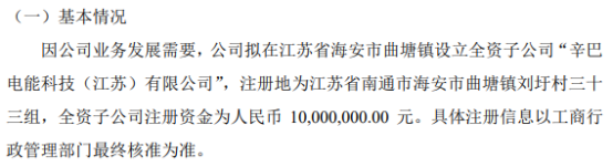 挖贝网2月8日,辛巴科技(873609)近日发布公告,因公司业务发展需要,公司拟在江苏省海安市曲塘镇设立全资子公司“辛巴电能科技(江苏)有限公司”,注册地为江苏省南通市海安市曲塘镇刘圩村三十三组,全资子公司注册资金为人民币10,000,000.00元。具体注册信息以工商行政管理部门最终核准为准。